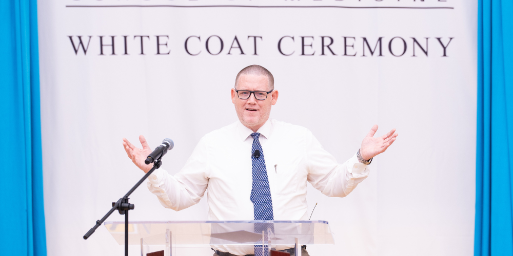 The event’s keynote speaker, Michael Keenaghan, MD ’06, assistant dean of students and director of Clinical Academic Advising, delivered a powerful message to attendees: “If you remember just one thing from today, let it be this—be kind. Kind to your patients, your colleagues, and yourself. That simple choice will make you uncommon, unwavering, and unstoppable. Congratulations, welcome to SGU, and I look forward to the day I get to call you ‘doctor’.”
